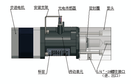 微型柱塞泵通過泵頭的2個1/4''-28內螺紋接口,連接進、出口管路。
